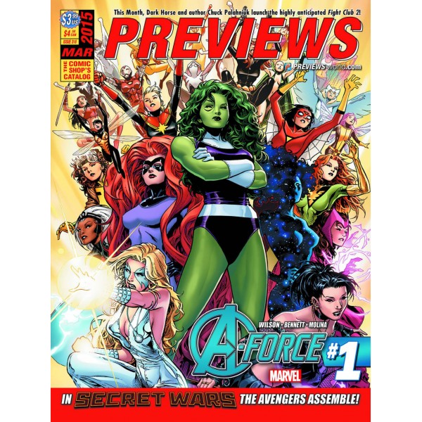 PREVIEWS DIAMOND & MARVEL Visuels des comics, avec les couvertures variantes. Parfois une ou plusieurs pages du ou des comics. Noms des scénaristes, dessinateurs, encreurs, lettreurs. Le ou les artistes des couvertures. Un résumé descriptif du ou des comics. Le format avec le nombre de page. Le prix et la date de vente prévue dans les comics shop.